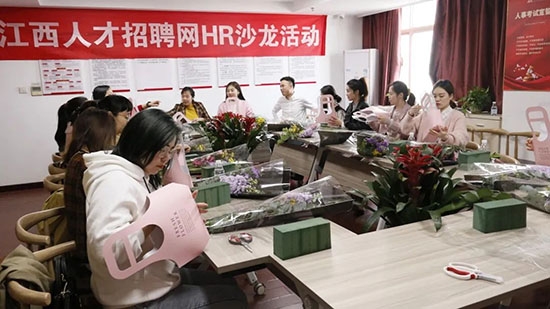 阳春三月,鸟语花香。在第112个国际妇女节到来之际,江西人才招聘网HR俱乐部在聚才人力集团活动室为会员客户举办了“花舞女神季 花艺沙龙”活动。通过学习插花来装饰自己的生活环境,给予女性静心、修心、养心的工作学习环境。